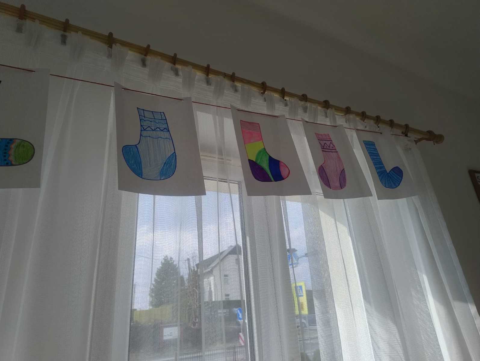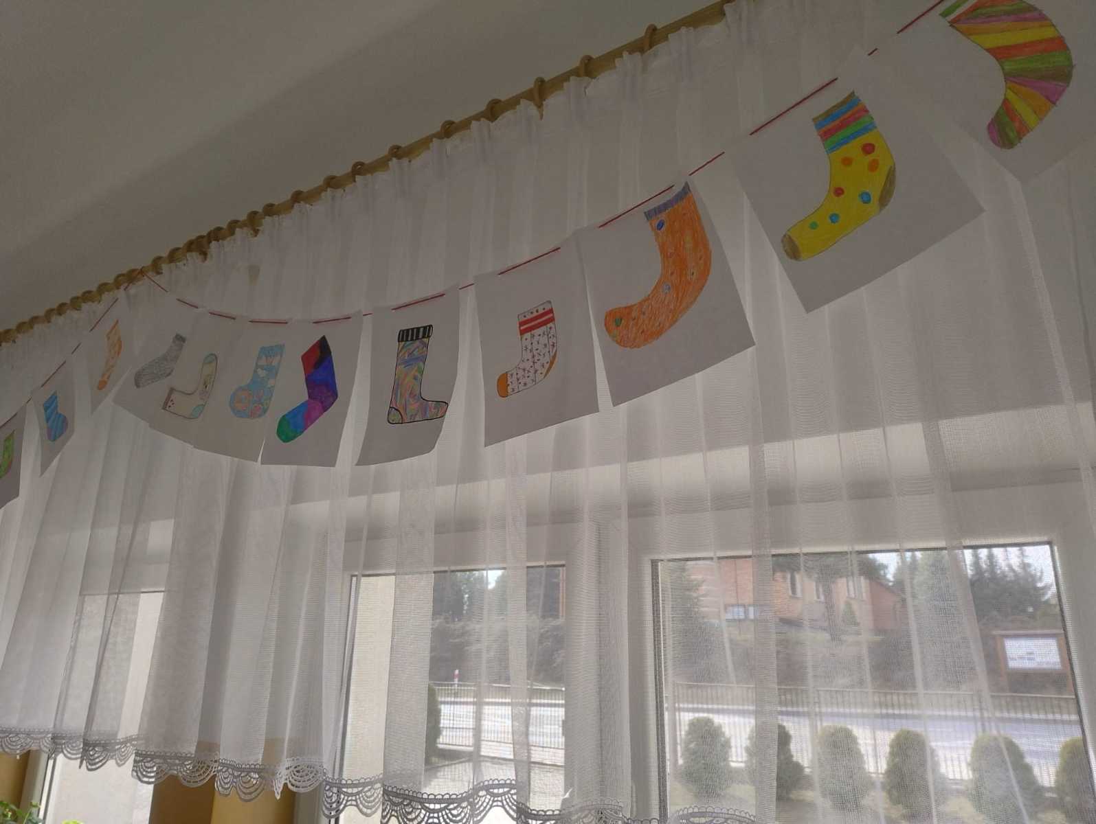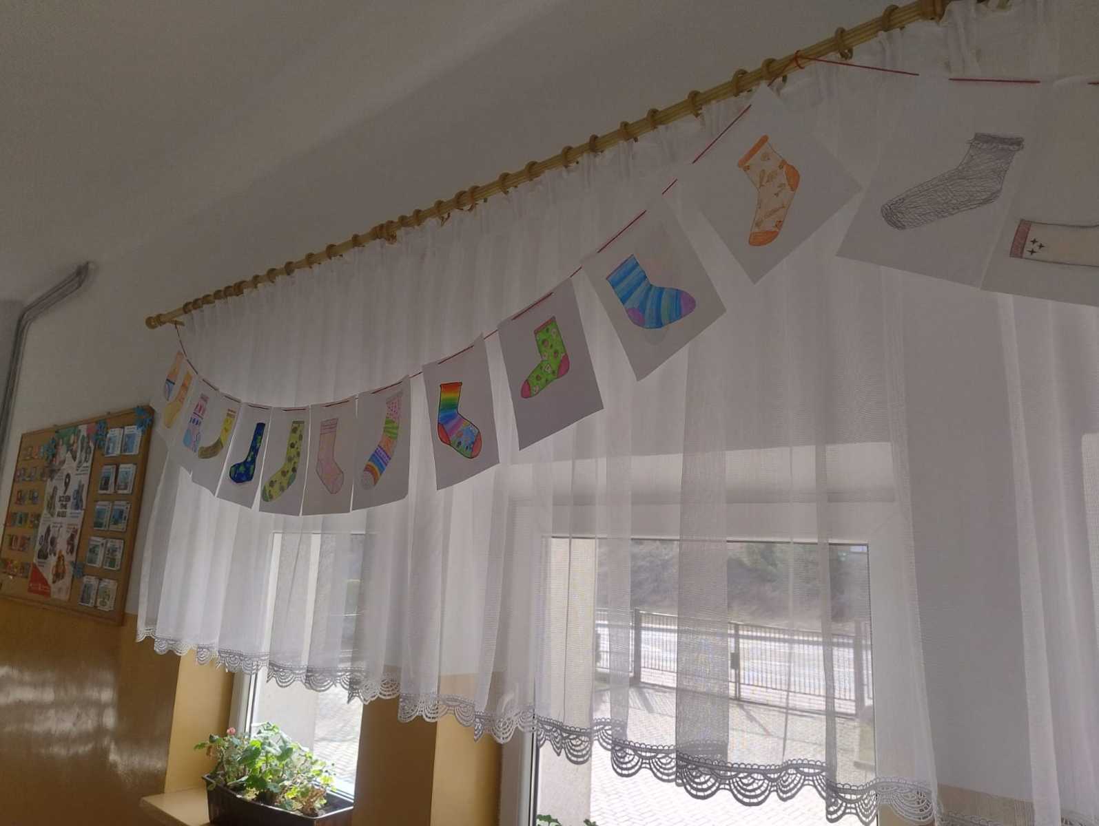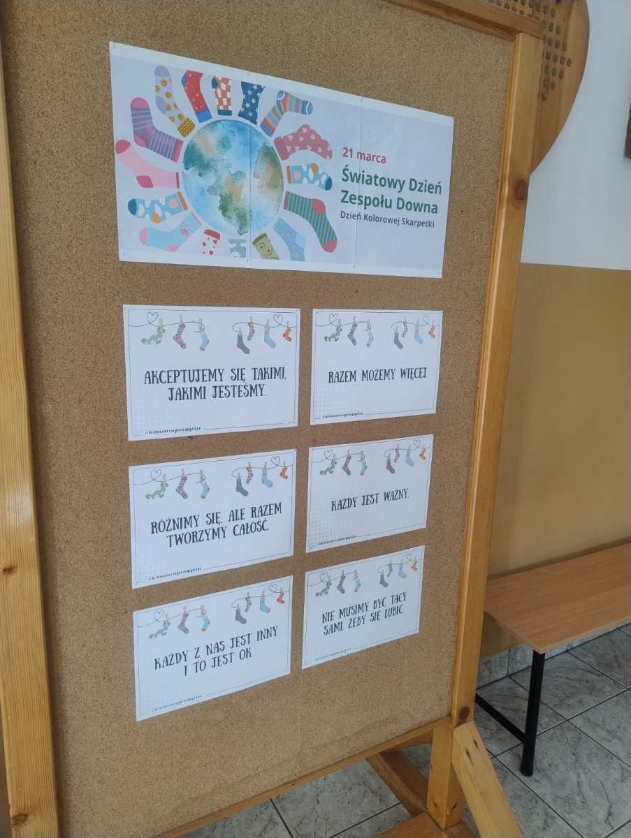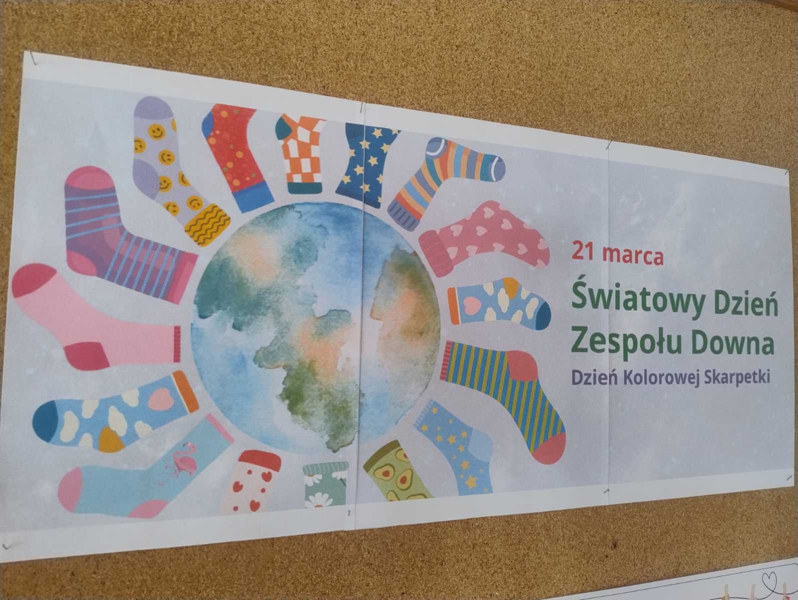 Symbolem Zespołu Downa są kolorowe skarpetki będące synonimem niedopasowania społecznego i genotypowego. Z okazji tego szczególnego dnia, na głównym korytarzu naszej szkoły pojawiły się kolorowe skarpetki, namalowane przez uczniów oraz tablica informująca.