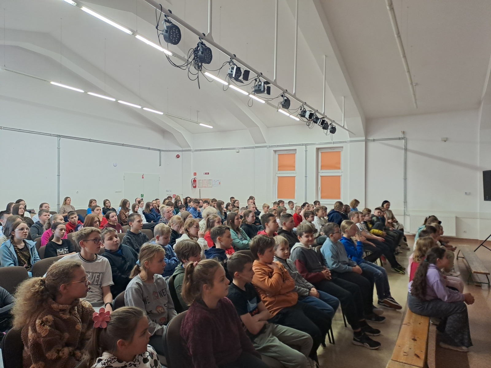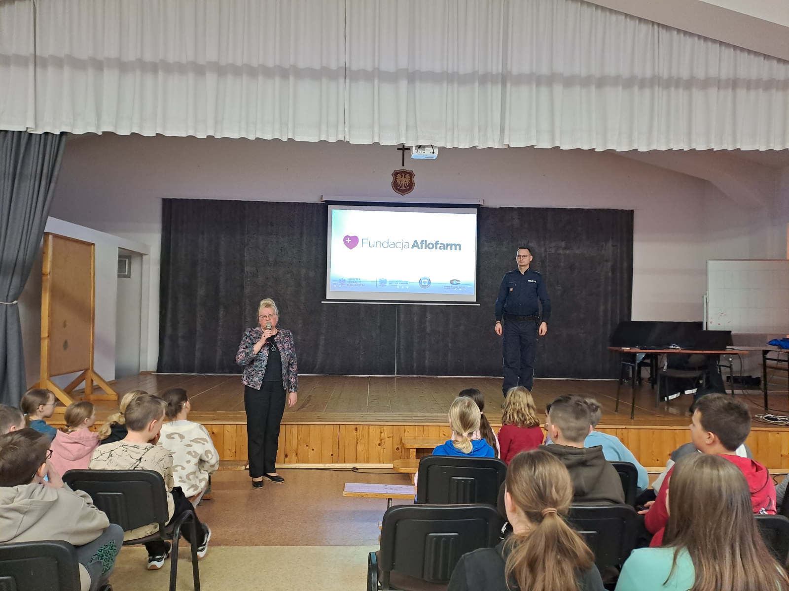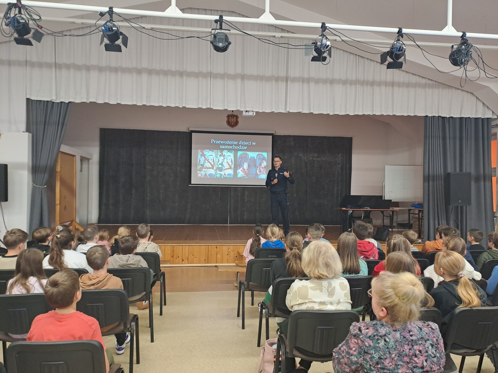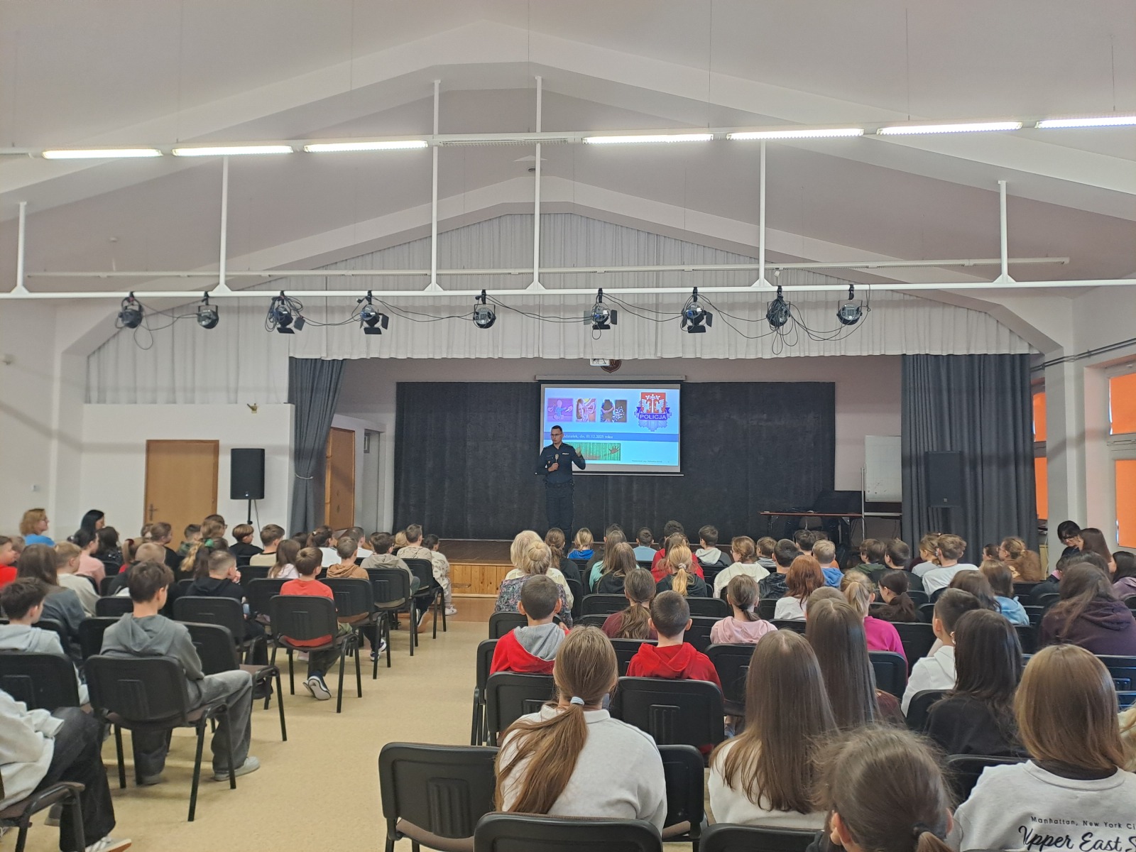 1 grudnia br. w naszej szkole odbyła się prelekcja dla uczniów z klas IV – VIII przedstawiona przez funkcjonariusza Komendy Powiatowej Policji w Myślenicach – st. asp. Sebastiana Kruka. Tematem prelekcji było bezpieczeństwo w drodze do i ze szkoły, przemoc rówieśnicza, przeciwdziałanie uzależnienieniom oraz odpowiedzialność karna nieletnich. Dzieci chętnie uczestniczyły w spotkaniu, odpowiadając na pytania zadawane przez Pana Policjanta oraz dzieląc się swoimi spostrzeżeniami. Celem prelekcji było uświadomienie uczniom jak ważne jest dbanie o własne bezpieczeństwo oraz bezpieczeństwo innych osób. Serdecznie dziękujemy funkcjonariuszowi KPP w Myślenicach za poświęcony czas, cenne wskazówki i miłą atmosferę spotkania.